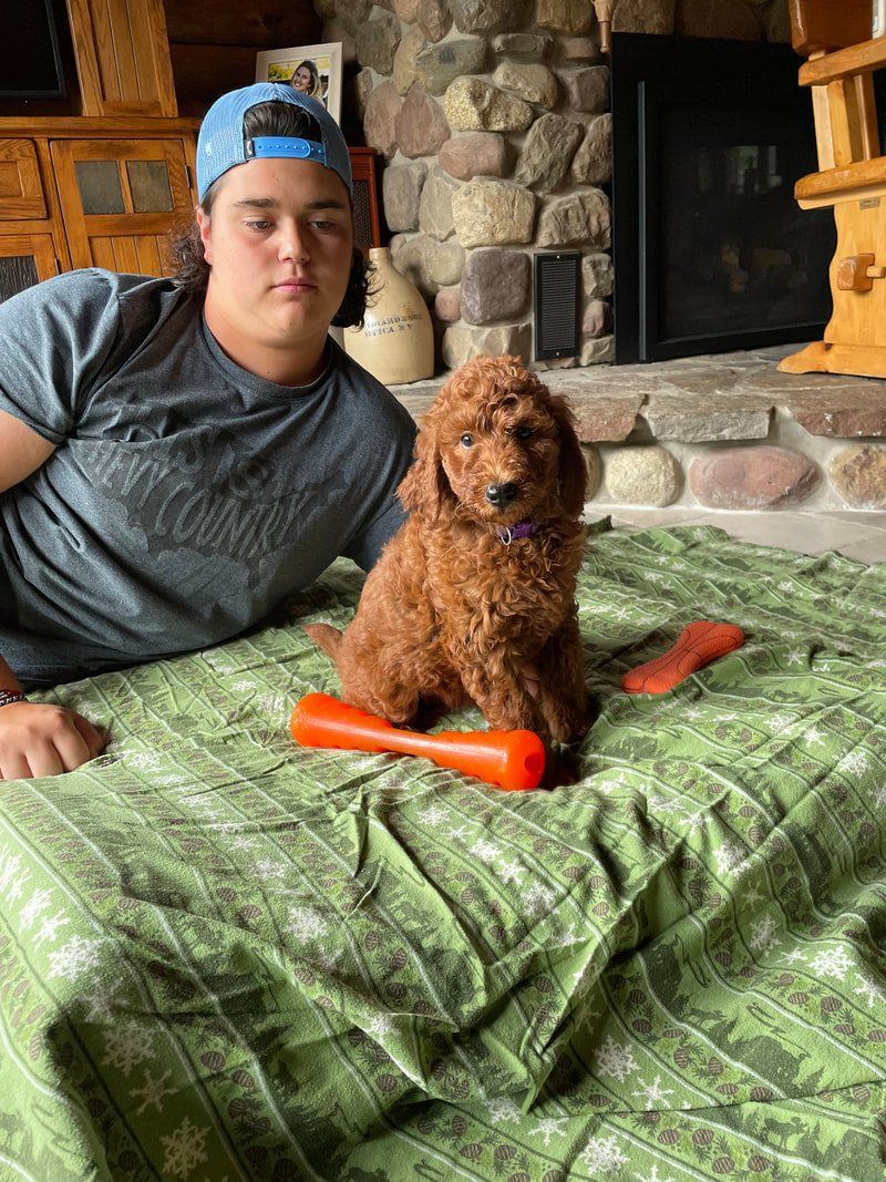 Melby is now 17. He enjoys being the Lacross goalie for our school in the spring, playing foot ball in the fall, and down hill skiing in the winter. In his free time he helps evaluate puppies and socialize them as they are growing. Melby helps with hillside looking great! He is still looking for his forever poodle.